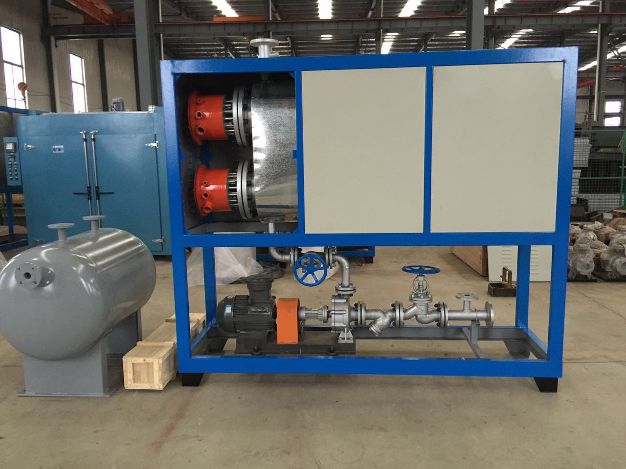 導熱油爐排氣流程: 1、導熱油通過膨脹槽注油口處加注,并通過膨脹口管道流入設備及油爐本體內,此時注油時一定要打開系統中所有的閥門(放油閥除外),讓導熱油流入筒體及需加熱設備內。 2、當液面顯示約為膨脹槽高度1/2時,停止注油。 3、首 行常溫排氣:接通電源,打開導熱油加熱器的進出口閥門及排氣閥(膨脹管道閥門需一直開著以及時補充油量),按動油泵啟動按鈕,油泵運行,油泵應按箭頭指示方向正常運行,壓力表壓力顯示在規定范圍內,視聽油泵運行情況,如有異常現象應立即停機檢查,將故障排除后再重新起動油泵,進行常溫下排氣,直至壓力表指示穩定。進行常溫排氣時,要注意觀察膨脹槽內的液位,當低于規定的液位高度時要及時進行補充。 4、升溫脫水:在確認常溫下運行正常后,即可進行升溫脫水排氣(操作前詳閱導熱油使用說明書及溫控儀使用說明書),升溫脫水排氣可按如下步驟進行: 步:升溫至100-120℃保溫 開始升溫時,應該控制升溫速度在50℃/h以內,并且監視壓力表顯示是否正常,如發現無壓力或壓力不穩,說明系統內仍有殘留氣體,此時要求按3要求重復進行常溫排氣操作,待系統壓力穩定后方可繼續,升溫至120℃后進行長時間保溫,保溫時間的長短與系統總容量及導熱油的質量有關。  第二步:升溫至150-180℃保溫。  排除油中輕組分、揮發物及殘余水分,請參照KRD系列導熱油加熱器系統脫水排氣曲線圖操作 第三步:脫水排氣完成后要關閉排氣閥(其它閥門無需關閉),投入正常升溫運行。 5、 升溫脫水排氣過程有關事項。 升溫過程中管路可能會發出碰擊的響聲,說明系統內有大量氣體或管道不暢,此時要降低升溫速度,待氣體排除便可消除聲響;如系管道不暢所至應予以排除。 脫水排氣過程可能會有大量氣體涌入膨脹槽,造成槽內導熱油外溢,操作前要在溢油管下安置好溢油容器。 進行脫水排氣時,現場必須有人員看守,發現異常及時處理。   對于所提的油泵無油或少許油流出的問題,解決方案如下: 1、 關閉出油口閥門,啟動油泵,觀察壓力表顯示情況,若無壓力,則說明回油口無油補充油泵,使得油泵空轉,無后續油及時補充,則請貴司檢查一下回油口的供油情況,此時請確保膨脹槽里有油并膨脹管道閥門打開和需熱設備有油并出油口閥門在打開狀態。 2、 如果以上要求都執行到位,壓力表還無壓力,請檢查油爐上的油泵、截止閥及過濾器是否堵塞。 3、 若壓力表顯示壓力值,而油泵、截止閥及過濾器并無堵塞,那油爐的出油口一定會按油泵所提供的流量進行流出。